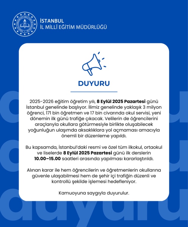 İstanbul Valiliği, okulların pazartesi günü 10.00'da başlayacağını duyurdu. Trafikteki aksaklıkların önüne geçebilmek için alınan karar göre okulumuzda eğitim 10.00 ile 14.30 saatleri arasında gerçekleştirilecek.